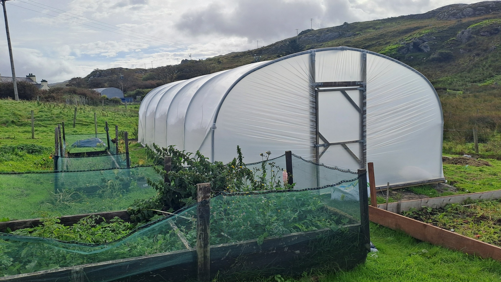 We manage a Community Garden in the Cashel village Glencolmcille. The garden comprises several outside beds and a polytunnel. Unfortunately, our polytunnel in the garden was badly damaged in January 2025 during storm Eowyn. We applied to various funding opportunities to have it replaced, and with support received from the REACH fund of Donegal ETB, we were able to purchase a replacement polytunnel during the Summer. This polytunnel was erected in the end of August 2025.