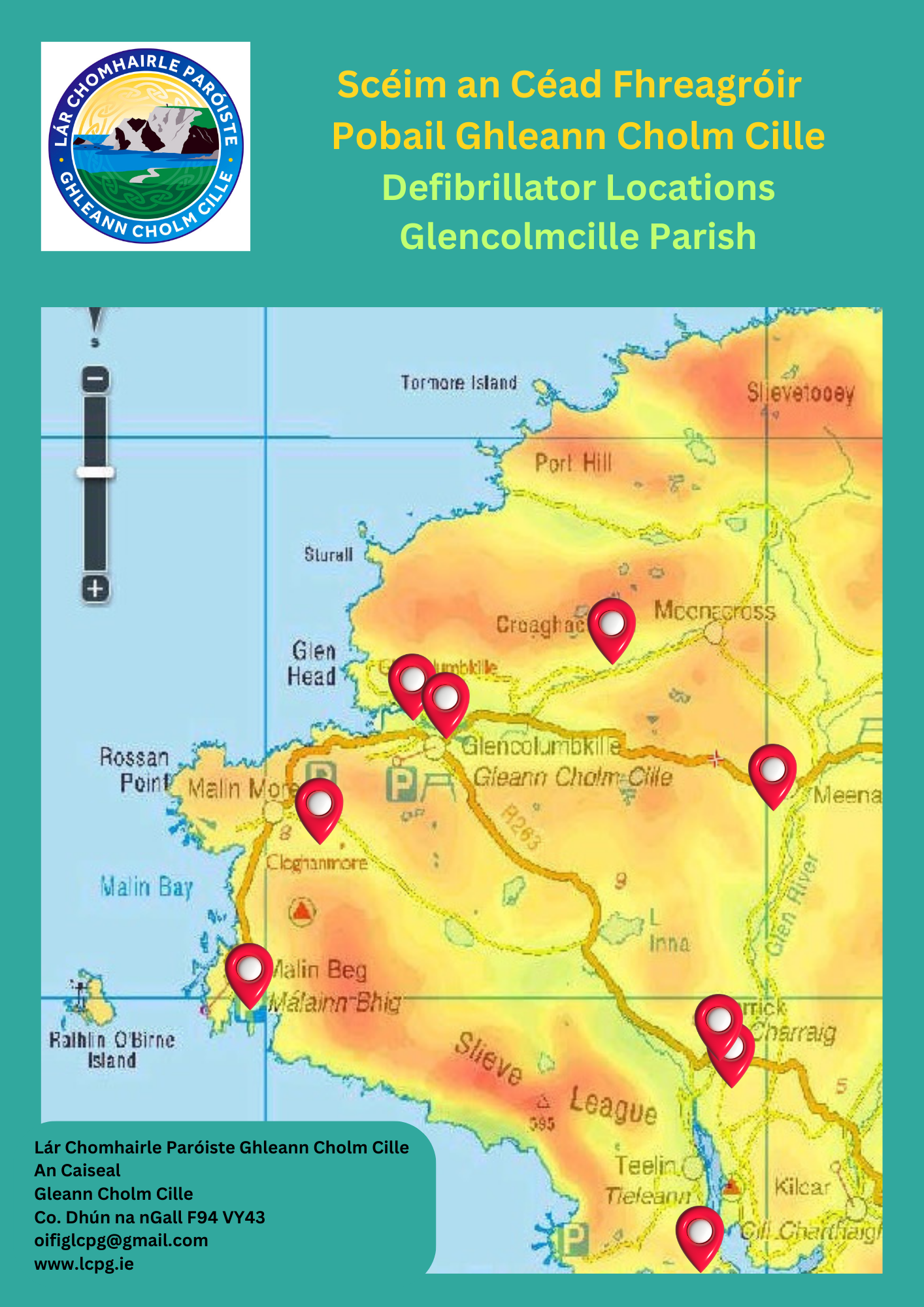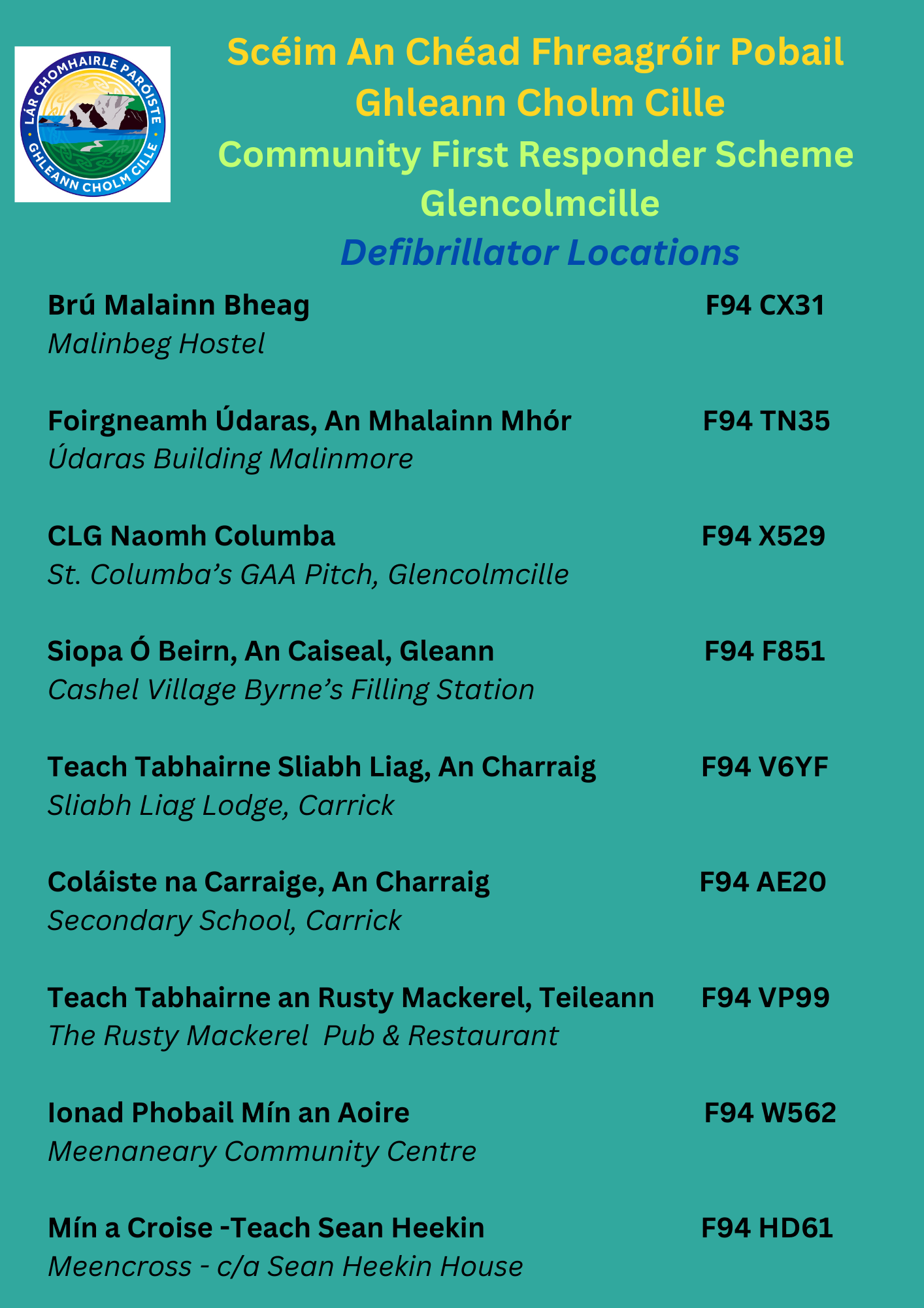 We purchase, manage and monitor seven defibrillators and the respective equipment necessary for their use in the local area. With checks on a monthly basis, and through financial support received from the HSE/National Lottery Fund, we ensure that all defibrillators are in proper working order, with all equipment up to date and checked regularly. These defibrillators are located in the following areas: Malinbeg, Malinmore, Cashel, Meenacross, Meenaneary, Carrick and Teelin, see map attached.
